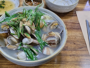 대표 메뉴인 콩국수는 진정으로 뛰어났습니다. 국물은 조개와 파래를 우린 맑고 시원한 재첩국처럼 맛있었습니다. 국수는 쫄깃하고 씹히기 좋았으며, 칼국수처럼 다듬어진 채로 제공되었습니다. 주재료인 조개는 신선하고 풍부하게 들어가 있어, 매 숟가락마다 해산물의 풍부한 맛을 즐길 수 있었습니다. 가격대는 콩국수 한 그릇에 10,000원 정도로 합리적이었습니다.
