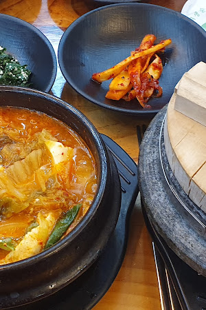 이곳의 대표 메뉴인 해물순두부(가격은 9,000원 정도로 기억해요)는 뚝배기에 보글보글 끓여져 나오는데, 국물이 칼칼하면서도 시원한 맛이 일품이었어요. 홍합, 새우, 조개 등 해산물도 꽤 넉넉히 들어가 있어서 순두부와 함께 곁들여 먹기 좋았습니다. 특히 순두부 자체는 부드럽고 고소했지만, 다른 곳과 비교했을 때 특별히 뛰어난 맛은 아니었어요. 오히려 이 집의 진짜 매력은 함께 나오는 돌솥밥이었는데, 갓 지은 밥의 찰진 식감과 구수한 누룽지까지 즐길 수 있어서 만족스러웠습니다.