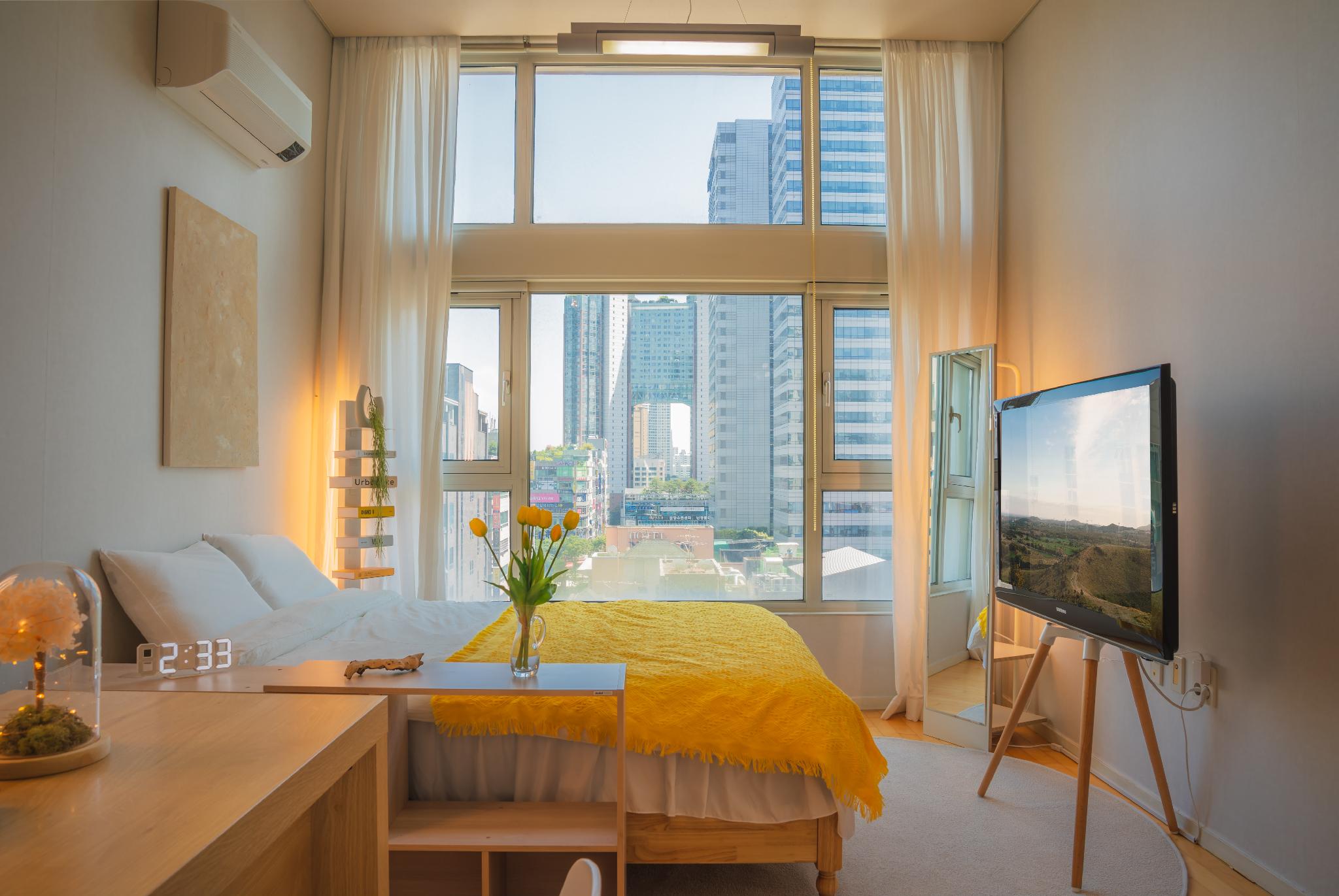 37m²의 아파트먼트는 혼자 또는 커플 여행에 최적의 공간이었습니다. 복층 구조로 공간 활용도가 높았고, 아늑한 침실과 깔끔한 욕실은 마치 내 집처럼 편안했습니다. 개폐식 창문을 열면 시원한 바람과 함께 활기찬 정자동 카페거리의 풍경이 한눈에 들어왔습니다. 넷플릭스와 디즈니플러스를 통해 객실에서 편안하게 영화를 즐길 수 있었던 점도 만족스러웠고, 제공되는 샴푸와 바디워시 향도 은은하니 좋았습니다.