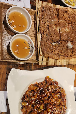 이곳의 대표 메뉴는 역시 쭈꾸미볶음! 저는 쭈꾸미세트 2인(12,900원)을 주문했는데, 불향 가득한 쭈꾸미와 고소한 도토리전, 상큼한 샐러드, 그리고 시원한 홍합탕까지 완벽한 조합이었습니다. 특히 홍합탕은 싱싱한 홍합을 듬뿍 넣고 깔끔하게 끓여내서 시원하고 칼칼한 국물 맛이 일품이었어요. 쭈꾸미의 불맛도 인상적이었는데, 적당히 매콤하면서 감칠맛이 돌아 자꾸만 손이 가더라고요. 가격 대비 양도 푸짐하고 맛도 좋아서 만족스러웠습니다.